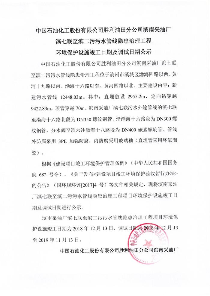 中國(guó)石油化工股份有限公司勝利油田分公司濱南采油廠濱七聯(lián)至濱二污污水管線隱患治理工程環(huán)境保護(hù)設(shè)施竣工日期及調(diào)試日期公示