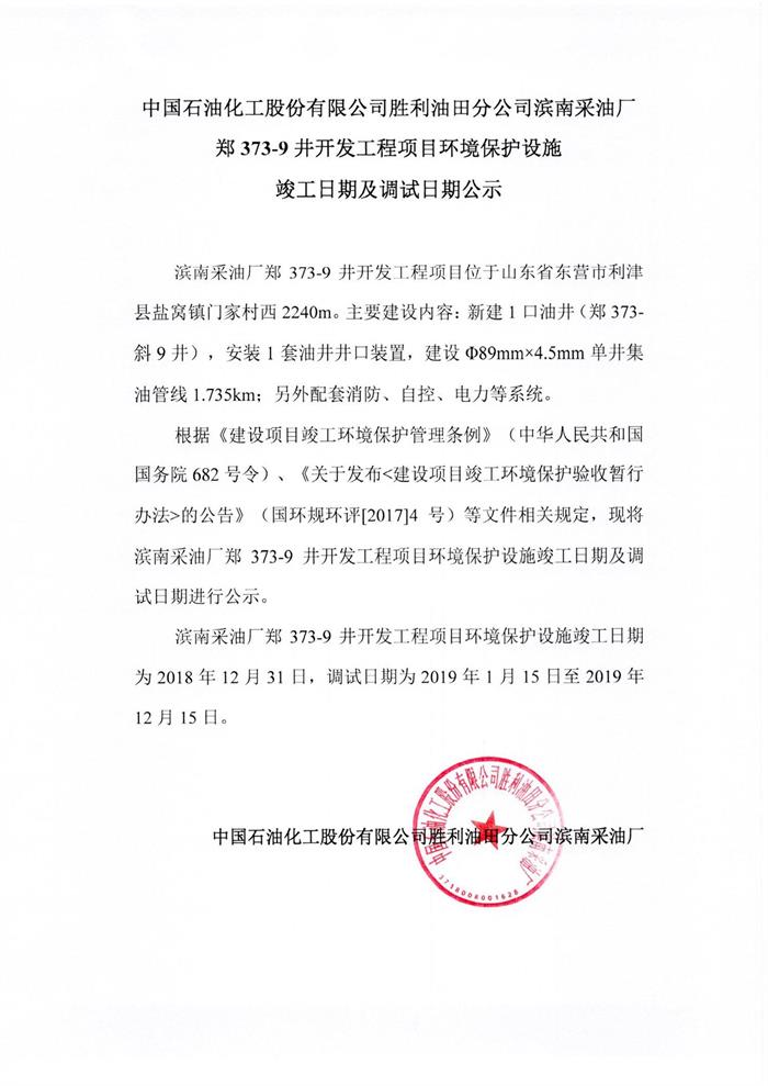 中國石油化工股份有限公司勝利油田分公司濱南采油廠鄭373-9井開發(fā)工程項(xiàng)目環(huán)境保護(hù)設(shè)施竣工日期及調(diào)試日期公示