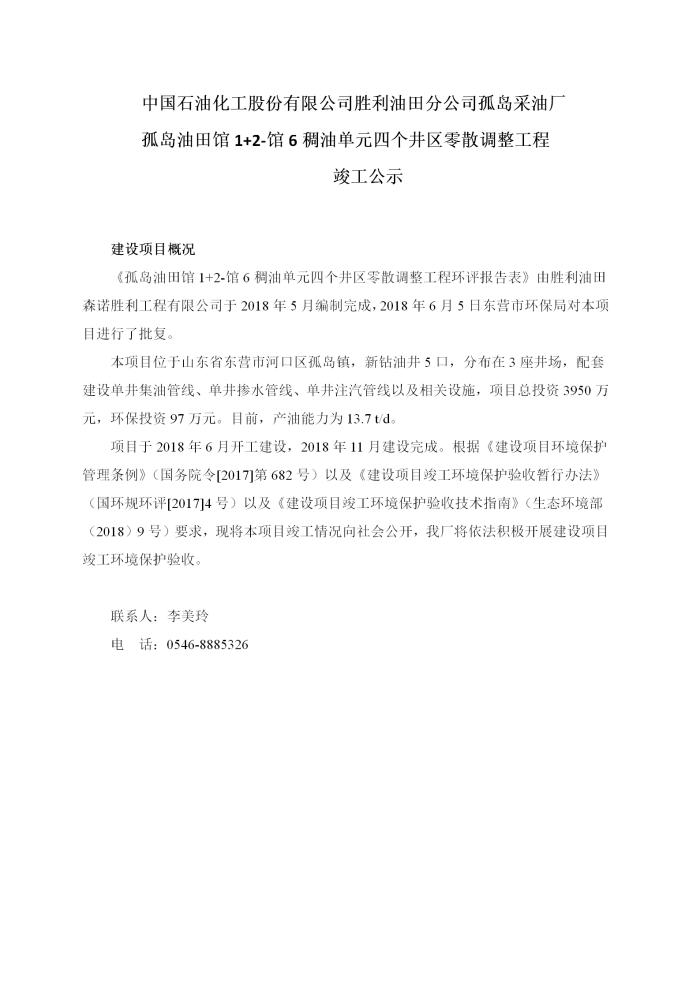 中國石油化工股份有限公司勝利油田分公司孤島采油廠孤島油田館1+2-館6稠油單元四個(gè)井區(qū)零散調(diào)整工程竣工公示