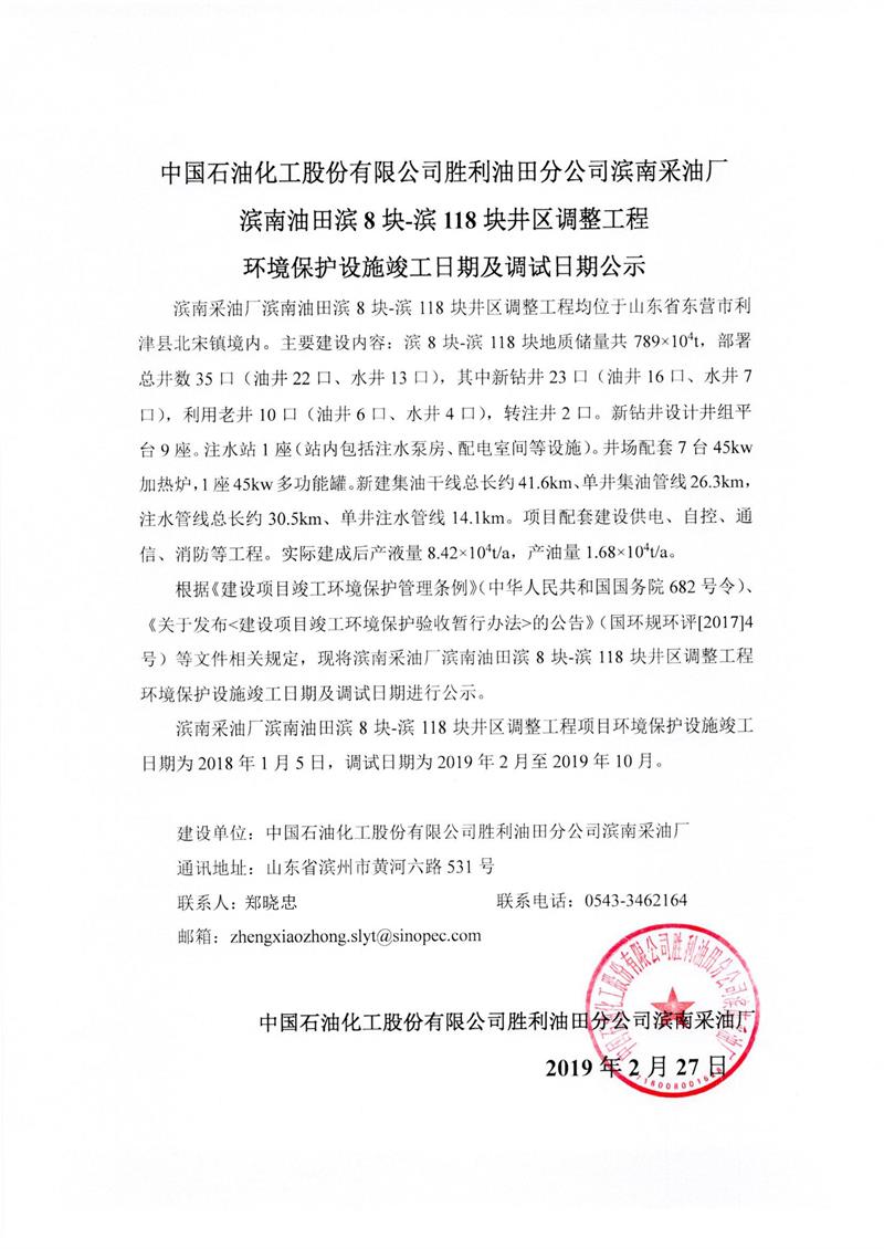 中國石油化工股份有限公司勝利油田分公司濱南采油廠濱8塊-濱118塊井區(qū)調(diào)整工程環(huán)境保護(hù)設(shè)施竣工日期及調(diào)試日期公示